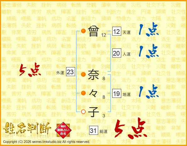 生活面を象徴する運勢です。外部から受ける影響力を表し、結婚運、家庭運や職場、環境への順応性を表します。総運から人運を引いた画数。姓や名が1文字の場合を除く。
