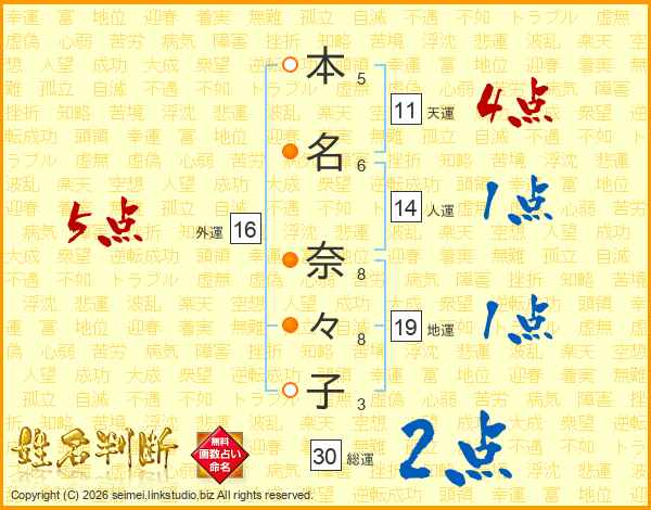 本(5画)名(6画) 奈(8画)々(8画)子(3画)