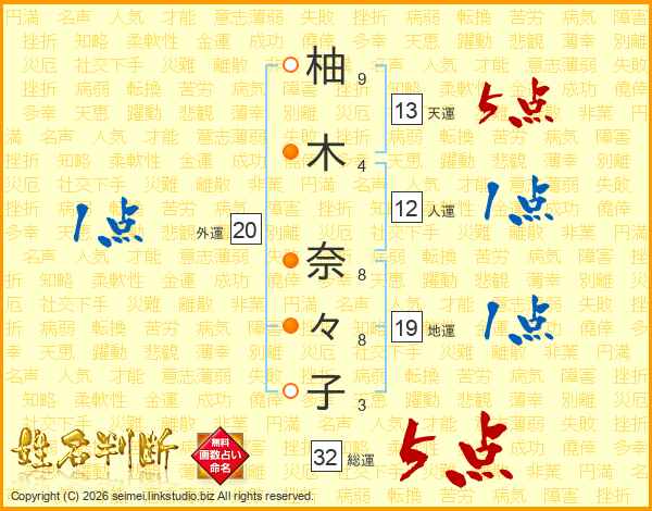 柚(9画)木(4画) 奈(8画)々(8画)子(3画)