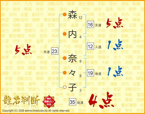 森(12画)内(4画) 奈(8画)々(8画)子(3画)