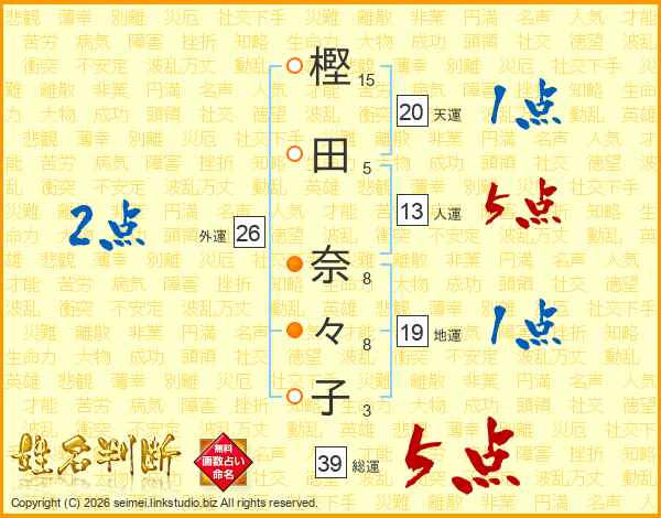 樫田奈々子さんの総運は39画の5点!