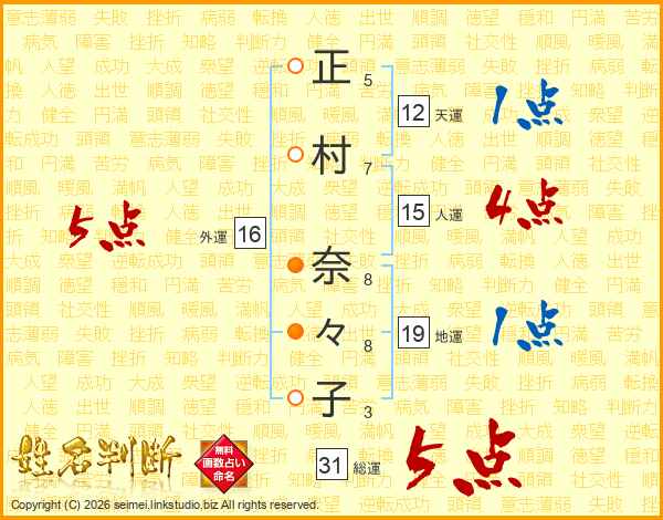 正(5画)村(7画) 奈(8画)々(8画)子(3画)