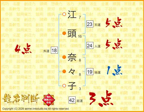 江(7画)頭(16画) 奈(8画)々(8画)子(3画)