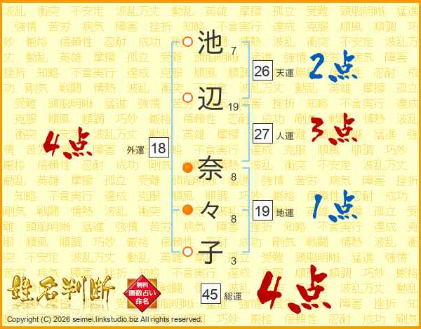 池(7画)辺(19画) 奈(8画)々(8画)子(3画)