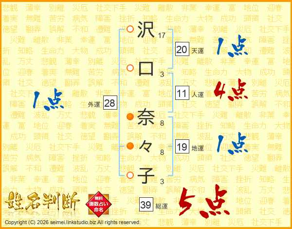 沢(17画)口(3画) 奈(8画)々(8画)子(3画)