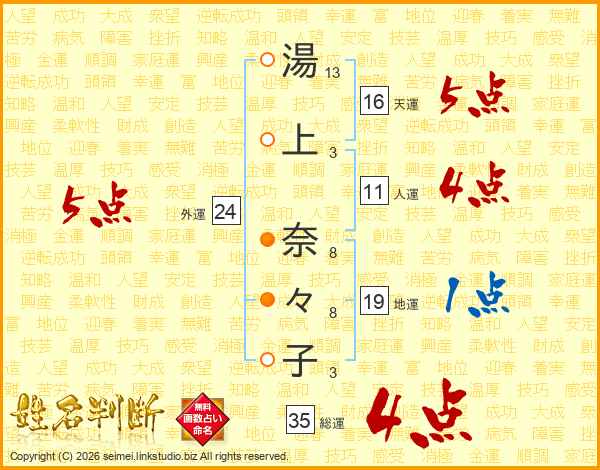 湯(13画)上(3画) 奈(8画)々(8画)子(3画)