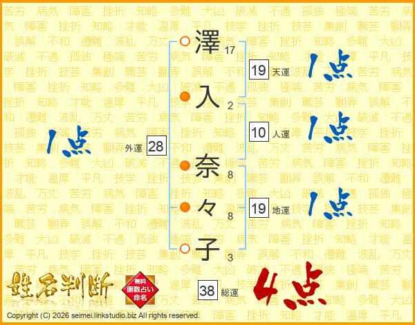 澤(17画)入(2画) 奈(8画)々(8画)子(3画)