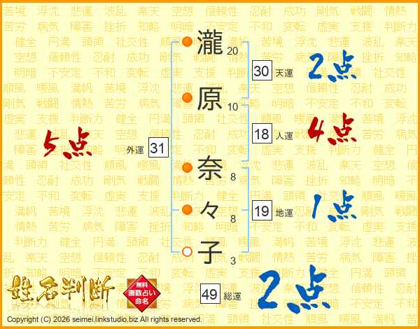 瀧(20画)原(10画) 奈(8画)々(8画)子(3画)
