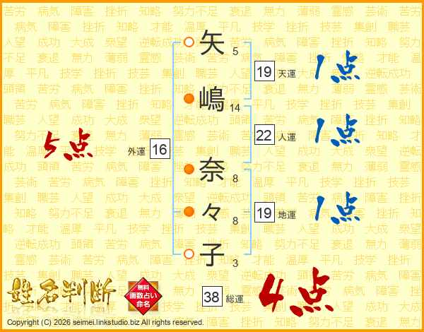 矢(5画)嶋(14画) 奈(8画)々(8画)子(3画)