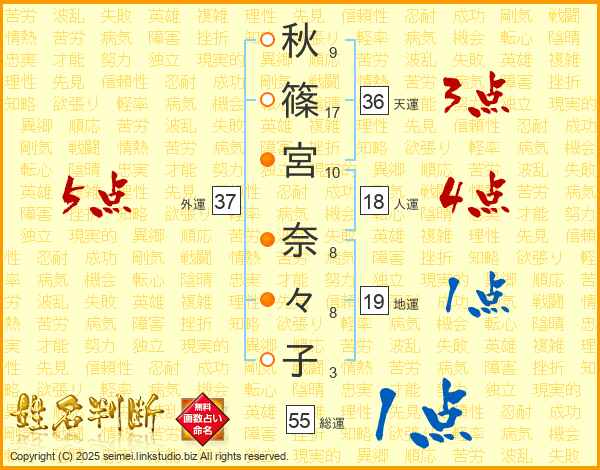 秋(9画)篠(17画)宮(10画) 奈(8画)々(8画)子(3画)