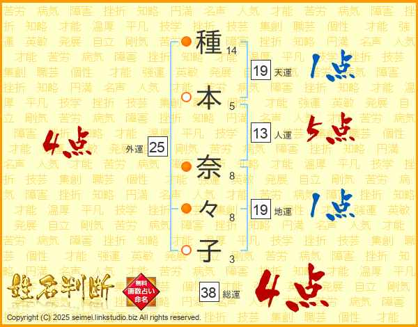 種(14画)本(5画) 奈(8画)々(8画)子(3画)