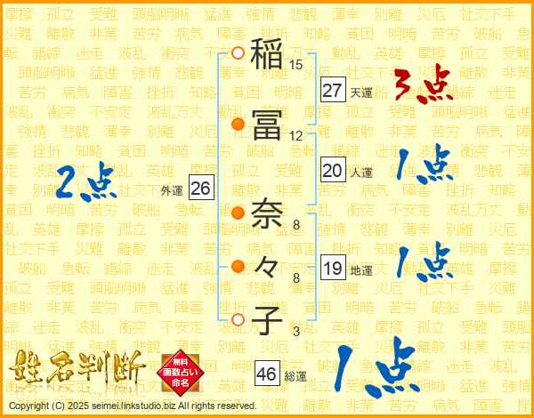 稲(15画)冨(12画) 奈(8画)々(8画)子(3画)
