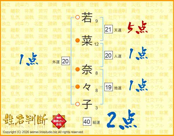 若(9画)菜(12画) 奈(8画)々(8画)子(3画)