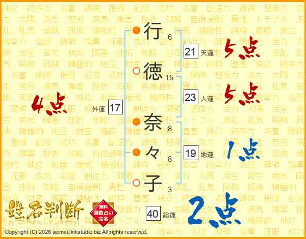 行(6画)徳(15画) 奈(8画)々(8画)子(3画)