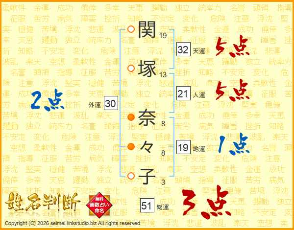 関(19画)塚(13画) 奈(8画)々(8画)子(3画)