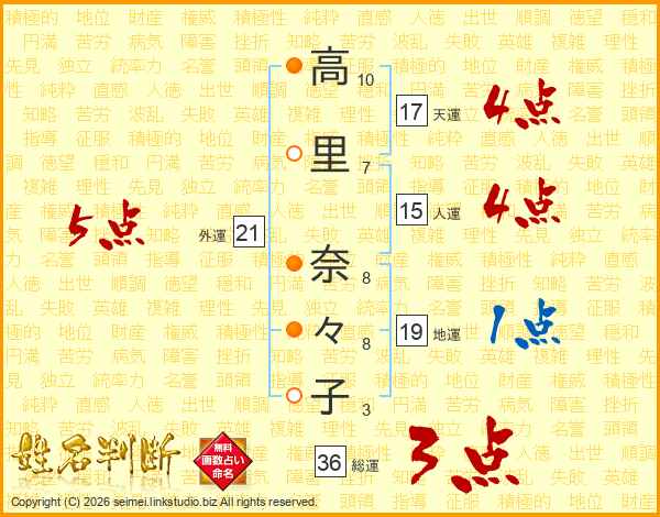 高(10画)里(7画) 奈(8画)々(8画)子(3画)