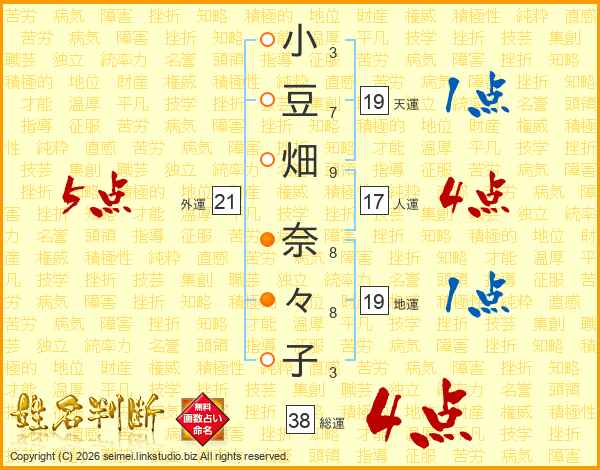 小(3画)豆(7画)畑(9画) 奈(8画)々(8画)子(3画)