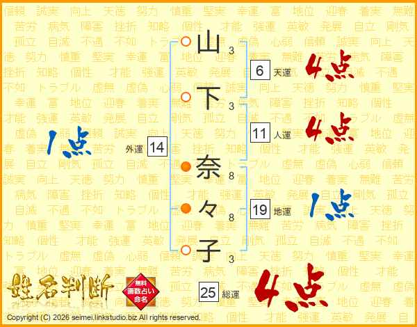 山(3画)下(3画) 奈(8画)々(8画)子(3画)