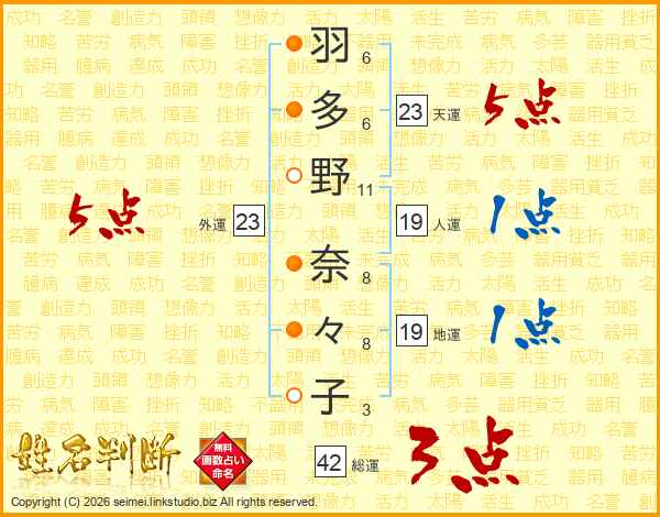 羽(6画)多(6画)野(11画) 奈(8画)々(8画)子(3画)