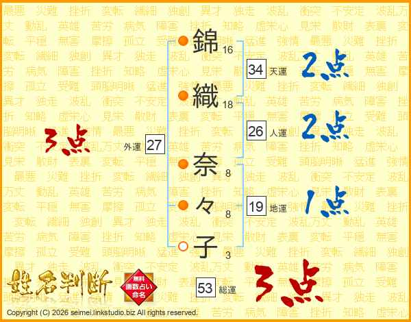 錦(16画)織(18画) 奈(8画)々(8画)子(3画)