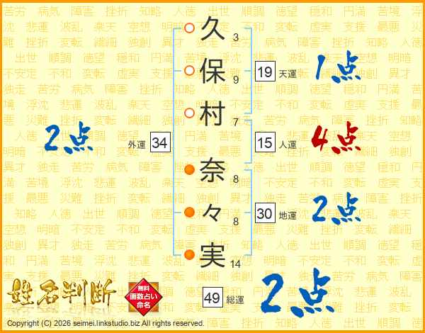 久(3画)保(9画)村(7画) 奈(8画)々(8画)実(14画)