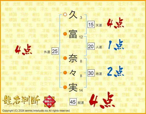 久(3画)富(12画) 奈(8画)々(8画)実(14画)