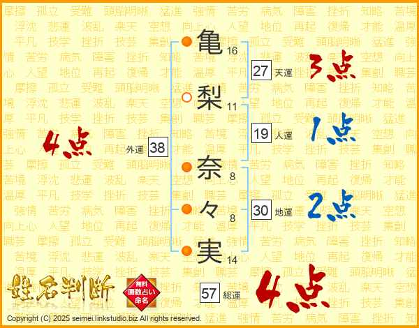 亀(16画)梨(11画) 奈(8画)々(8画)実(14画)