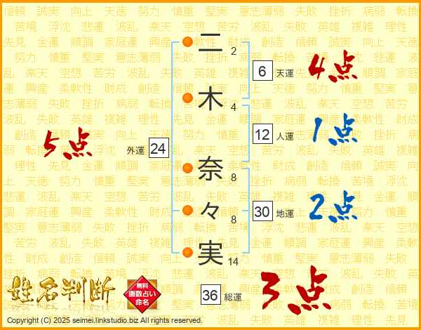 二(2画)木(4画) 奈(8画)々(8画)実(14画)