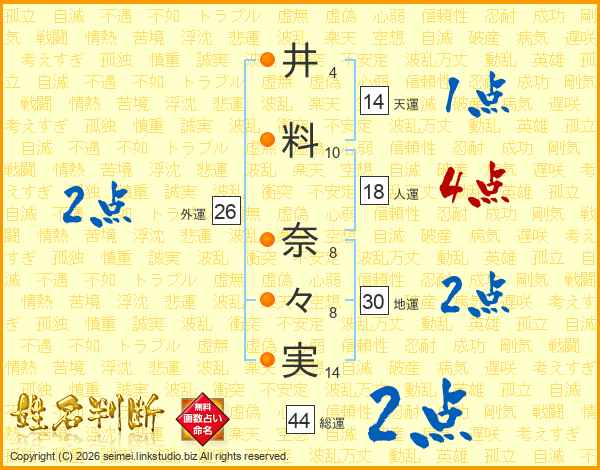 井(4画)料(10画) 奈(8画)々(8画)実(14画)