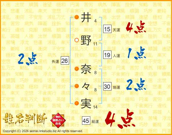 井(4画)野(11画) 奈(8画)々(8画)実(14画)