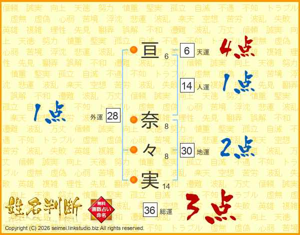 生活面を象徴する運勢です。外部から受ける影響力を表し、結婚運、家庭運や職場、環境への順応性を表します。総運から人運を引いた画数。姓や名が1文字の場合を除く。