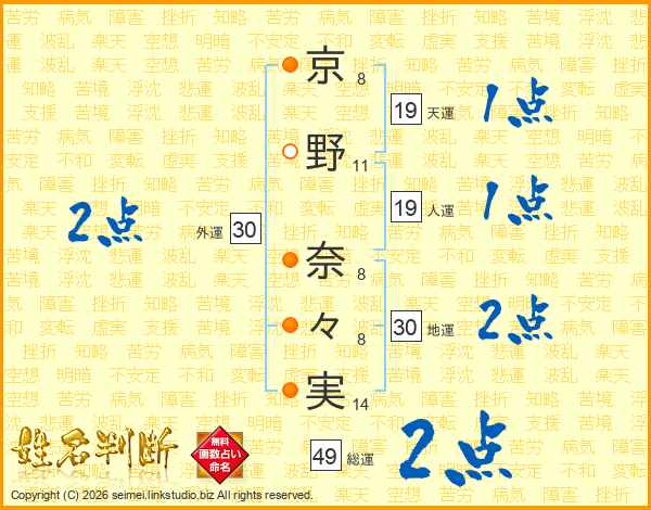 京(8画)野(11画) 奈(8画)々(8画)実(14画)