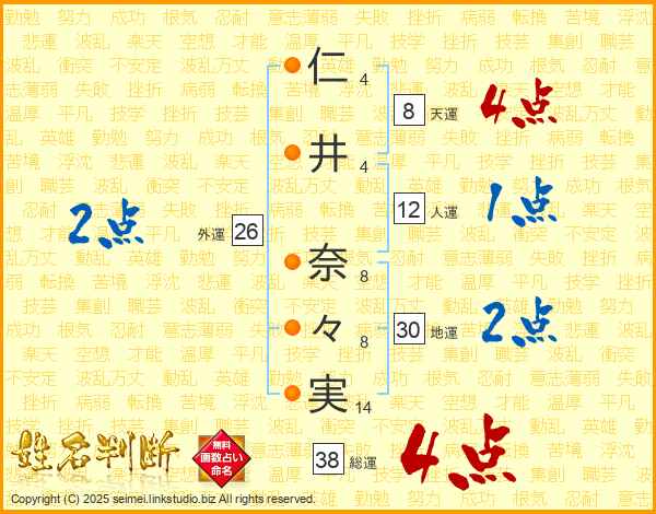 仁(4画)井(4画) 奈(8画)々(8画)実(14画)