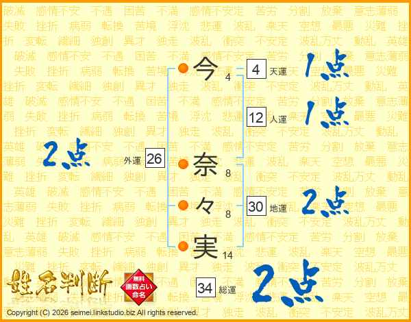 画数の奇数(○陽)と偶数(●陰)の配列で吉凶を占います。どちらかにかたよる名前は大凶名で避ける必要があります。画数の奇数偶数。