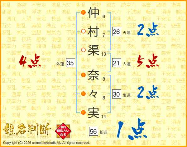 仲(6画)村(7画)渠(13画) 奈(8画)々(8画)実(14画)