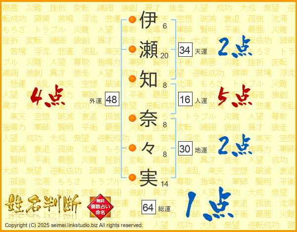 伊(6画)瀬(20画)知(8画) 奈(8画)々(8画)実(14画)