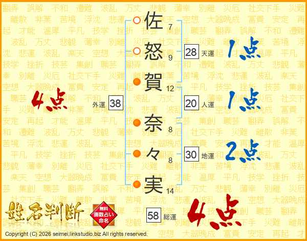 佐(7画)怒(9画)賀(12画) 奈(8画)々(8画)実(14画)