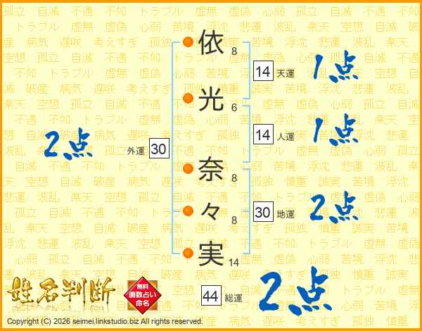 依(8画)光(6画) 奈(8画)々(8画)実(14画)