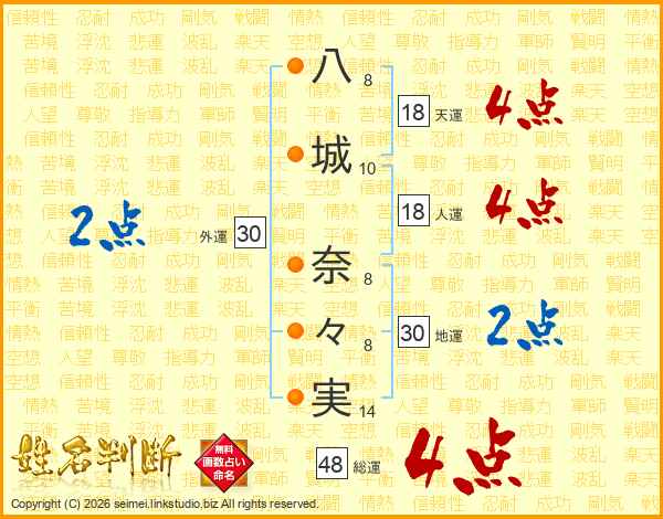八(8画)城(10画) 奈(8画)々(8画)実(14画)