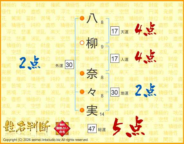 八(8画)柳(9画) 奈(8画)々(8画)実(14画)