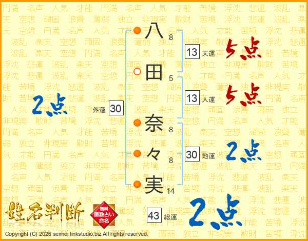八田奈々実さんの天運は13画の5点!