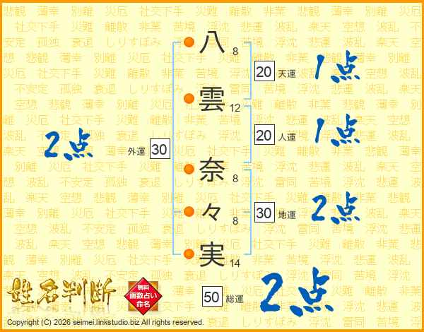 八(8画)雲(12画) 奈(8画)々(8画)実(14画)