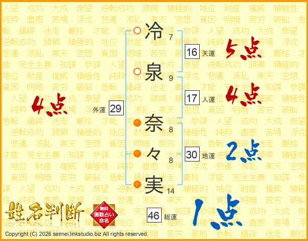 冷(7画)泉(9画) 奈(8画)々(8画)実(14画)