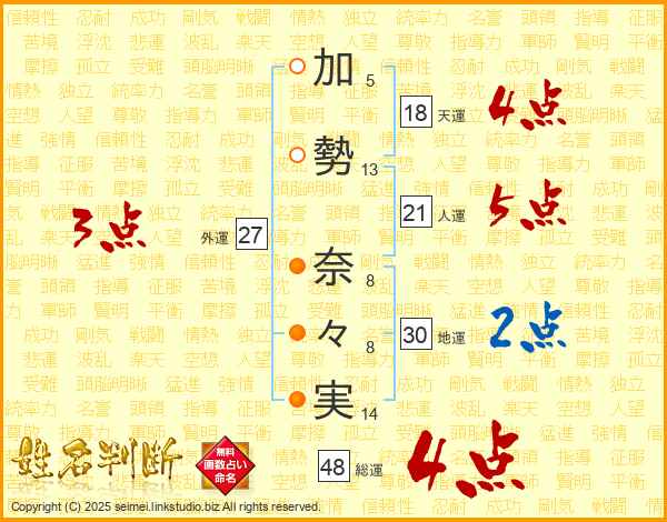 加(5画)勢(13画) 奈(8画)々(8画)実(14画)
