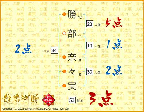 勝(12画)部(11画) 奈(8画)々(8画)実(14画)