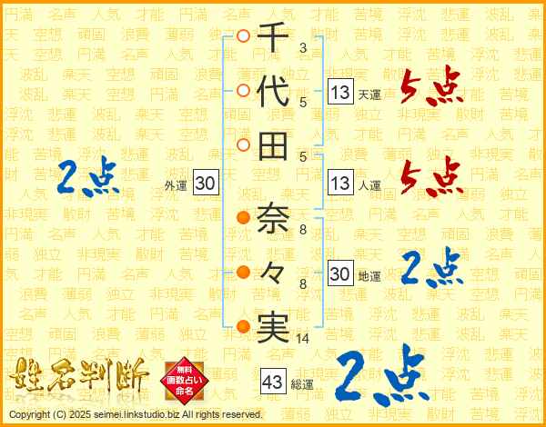 千(3画)代(5画)田(5画) 奈(8画)々(8画)実(14画)