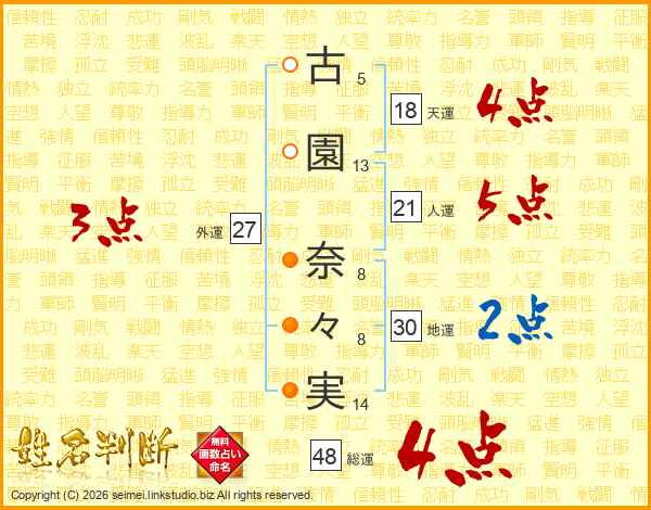 古(5画)園(13画) 奈(8画)々(8画)実(14画)