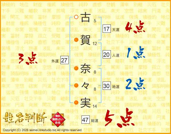 古(5画)賀(12画) 奈(8画)々(8画)実(14画)
