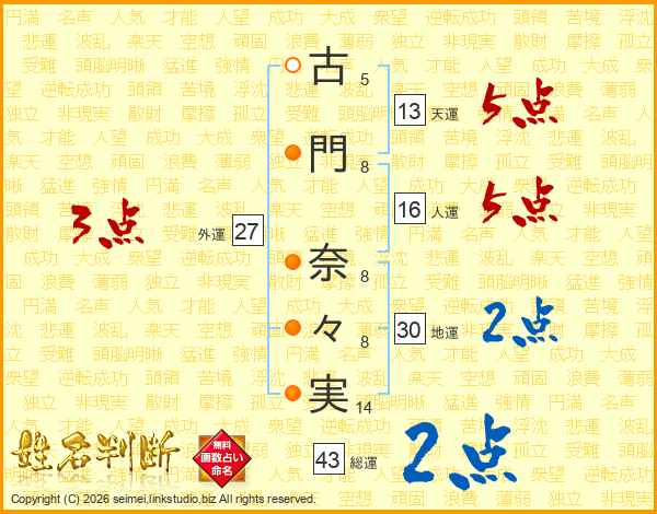古(5画)門(8画) 奈(8画)々(8画)実(14画)
