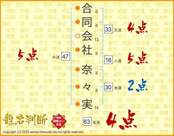 合(6画)同(6画)会(13画)社(8画) 奈(8画)々(8画)実(14画)